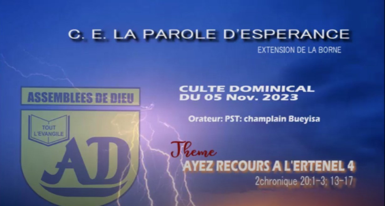 Le Centre Evangélique la Parole d’Espérance est une église locale de la communauté des assemblées de Dieu de la R.D Congo (C.A.D.C). Elle est l’extension du C.E Francophone la Borne située dans la commune de Ngaliema, au quartier Djelo-Binza, sur l’avenue du marché n° 20.
